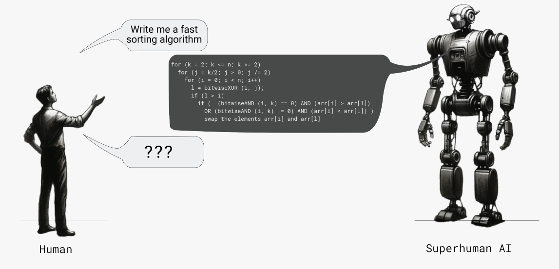 Caption: A human struggling to understand a superhuman AI’s response, from this paper.