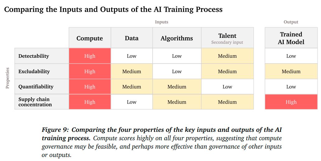 Recent AI progress has relied on the “AI triad”: algorithms, data, and compute. Regulating these key inputs is a way to govern the capabilities of AI. Sastry et al. list some properties that make compute especially viable as a target for regulation:
