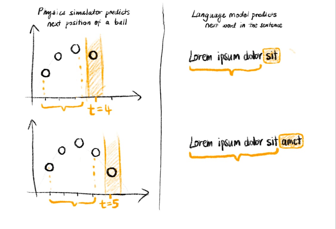 In the same way that a physics simulator uses a ball’s current and past positions to estimate its future position, an LLM uses the words in a string to predict what words are likely to come next.