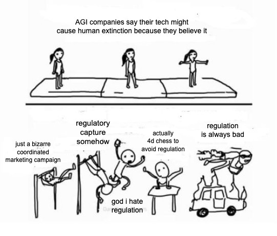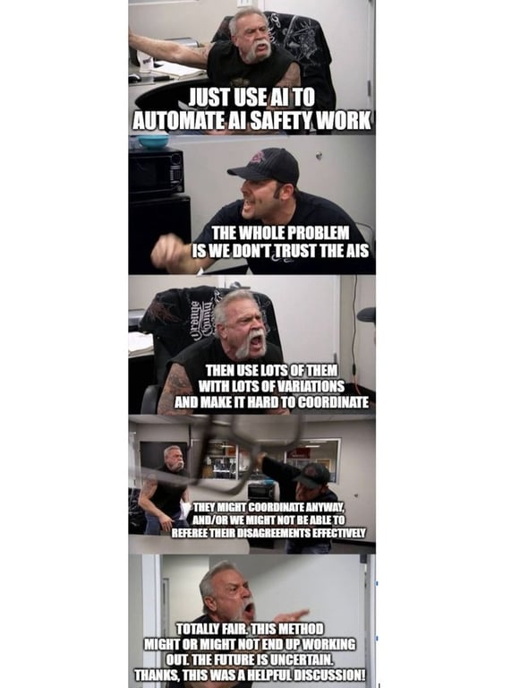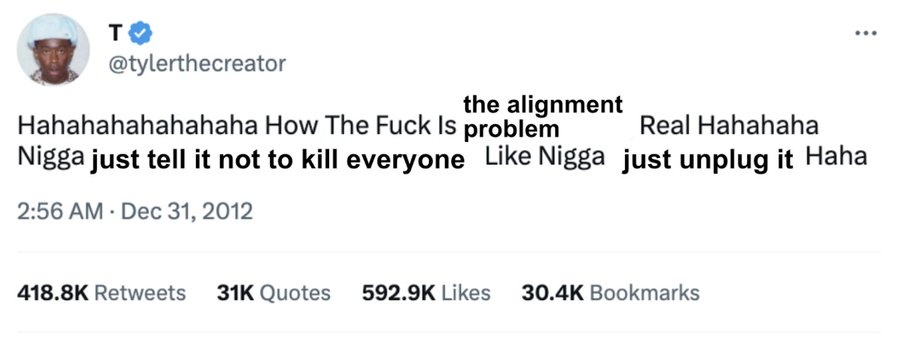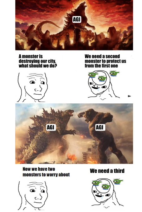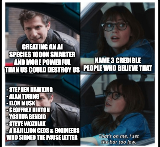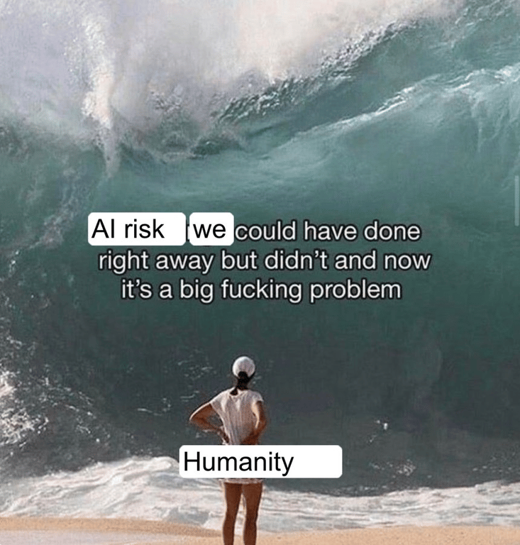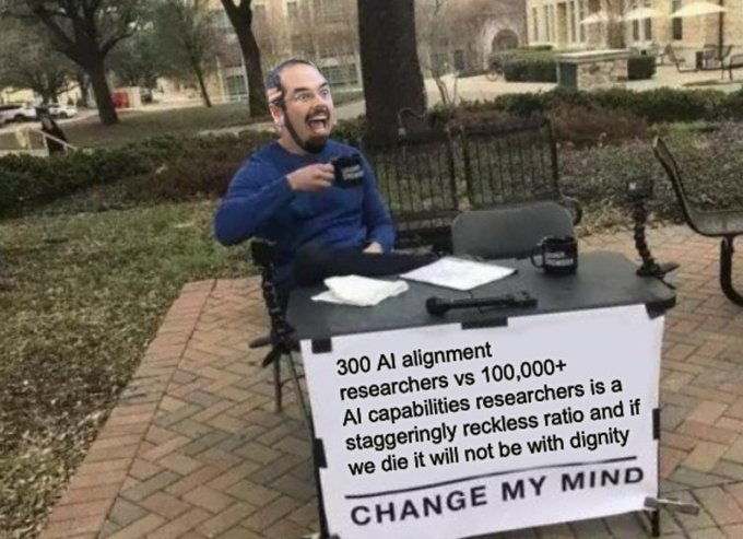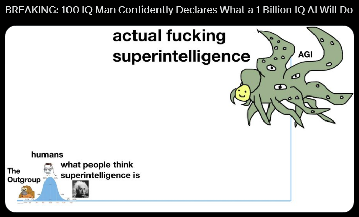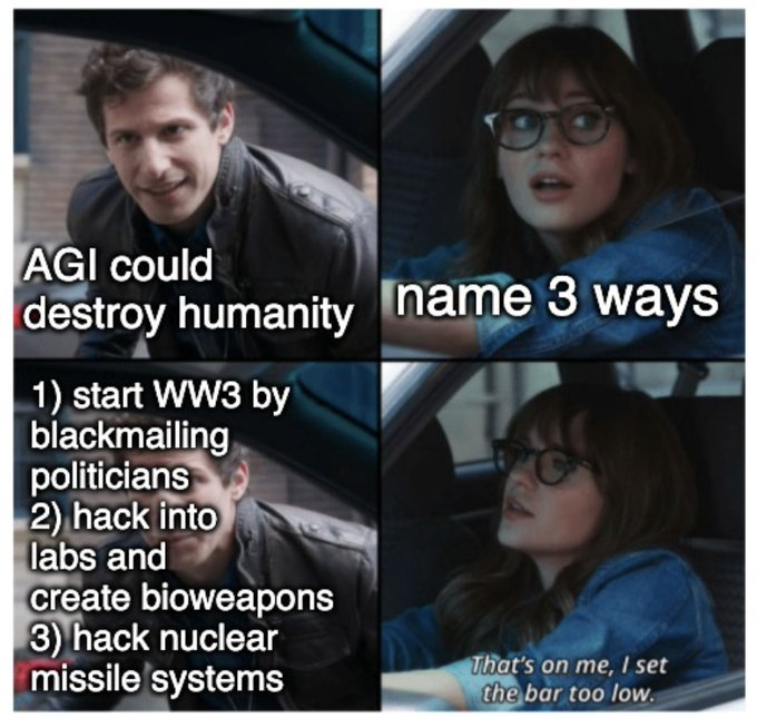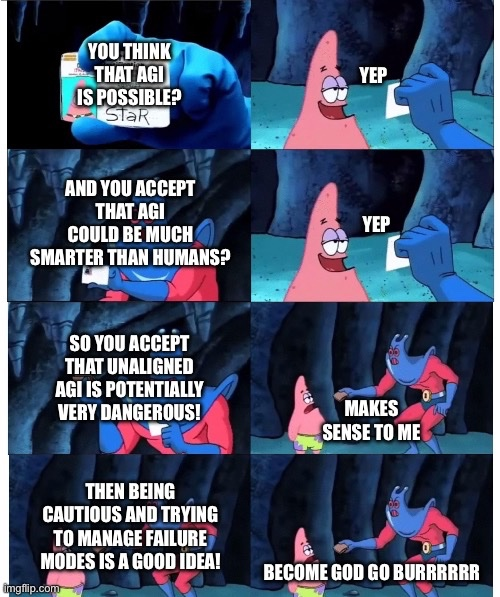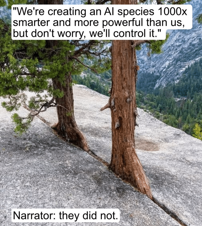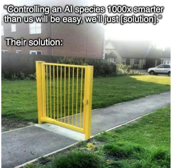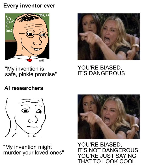 This is a database of memes relevant to AI existential safety, especially ones which respond to common misconceptions. Many of them were (re)posted by AI Notkilleveryoneism Memes on X. As with most memes, they are not full-fledged arguments, and regularly represent critics in uncharitable ways. Memes are fun and sometimes informative, but remember to take them with a grain of salt.