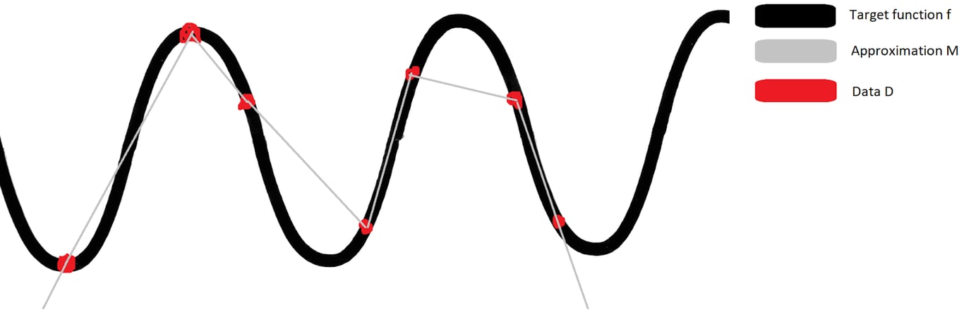 Example: Let’s say you want to predict how energetic you will feel over time. That’s your target function. So for a couple of days, whenever you get the chance, you log how energetic you feel (that’s your data D). And because you’re lazy, you decide to just draw straight lines between the data points. At the edges, you just keep drawing the outermost lines you got from D. That’s your learning process L, which will spit out some piecewise linear curve M. This is a poor learning process, for reasons we’ll get to in a bit.