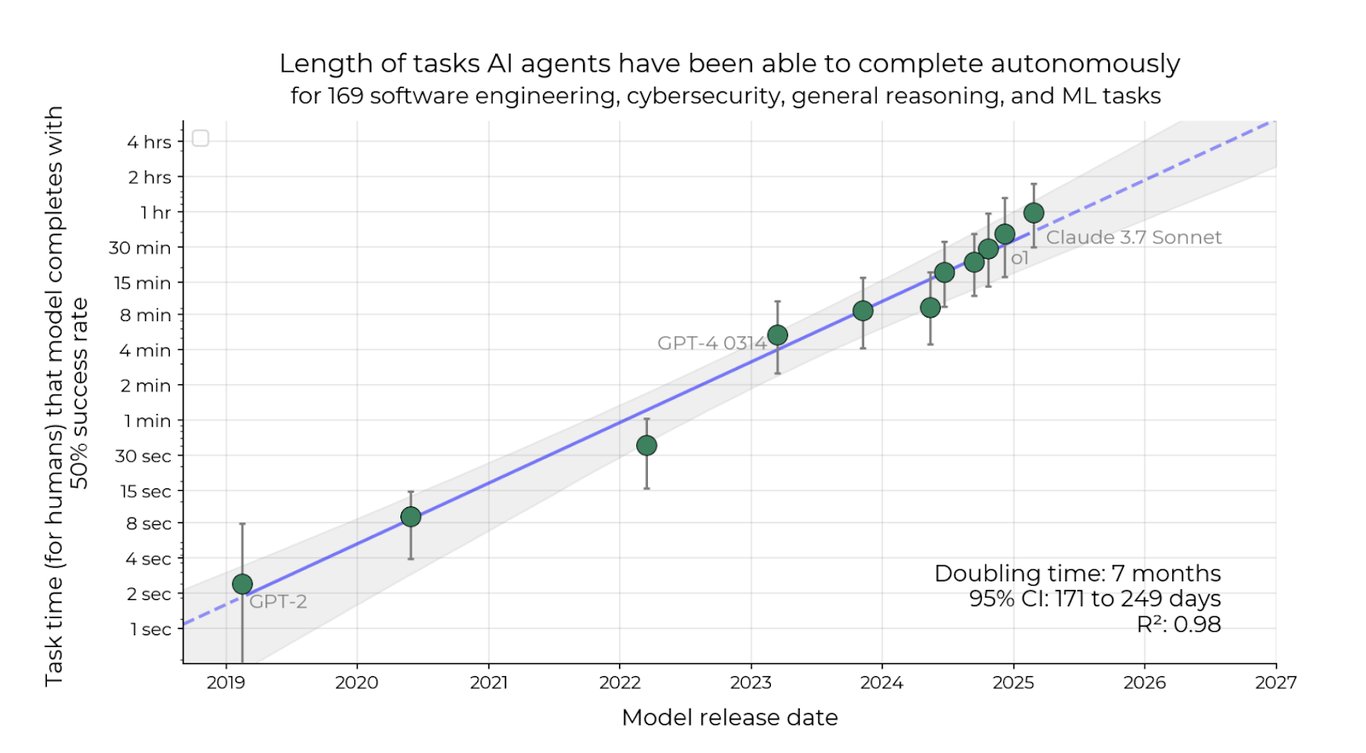 The authors benchmarked 13 frontier AI models released between 2019 and 2025 and found that their time horizons have been doubling approximately every 7 months: